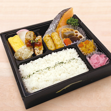 鮭塩焼き、竹輪いそべ天ぷら、豆腐野菜ハンバーグ、焼売、煮物、玉子焼き、かまぼこ、お惣菜