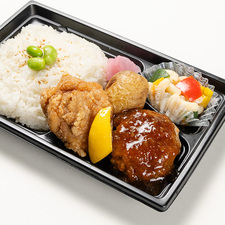 粗挽きハンバーグ・特製から揚げ・じゃがいも・お惣菜・漬物・ご飯