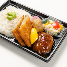 粗挽きハンバーグ・白身フライ・じゃがいも・お惣菜・漬物・ご飯