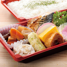 サバ塩焼き、竹輪いそべ天ぷら、煮物、八幡巻、焼売、玉子焼き、かまぼこ